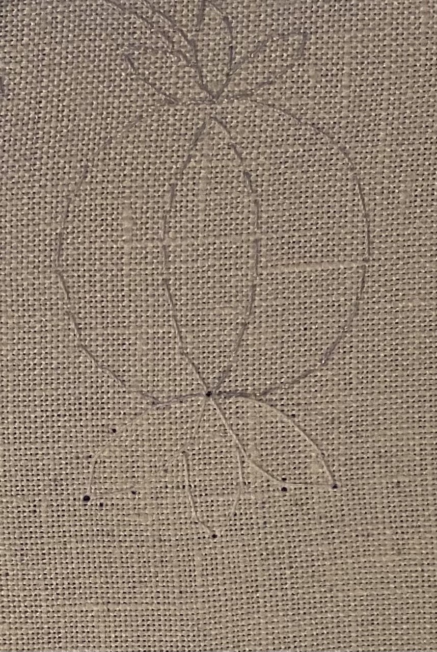 This is one of my favorite things about the stitch transfer method. It's so very forgiving and allows you to alter things any time you like. You can still see the stitch holes from the larger crown (which had five petals instead of three), but a little water dabbed on it and then allowed to dry easily removed those.With the design adjusted, it was time to stitch. I decided to do the pomegranate in rows of stem stitch and started with two rows of my lightest shade of peach for the inner edges: