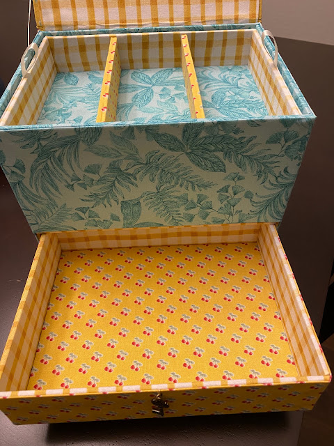 The deep yellow plaid was the third fabric Hal chose, and I think it complements the other two perfectly. The little tray in the top lifts out via the ribbon tabs on either side to reveal four more compartments underneath: